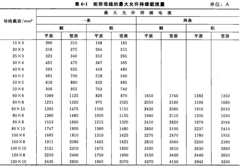 铝排载流量:采用口诀“厚三排宽乘十个,厚四排宽乘十二;加一依次往上添”,即3mm厚铝排载流量 \= 排宽 × 10,4mm厚 \= 排宽 × 12,厚度每增1mm系数加1(如5mm→13)。