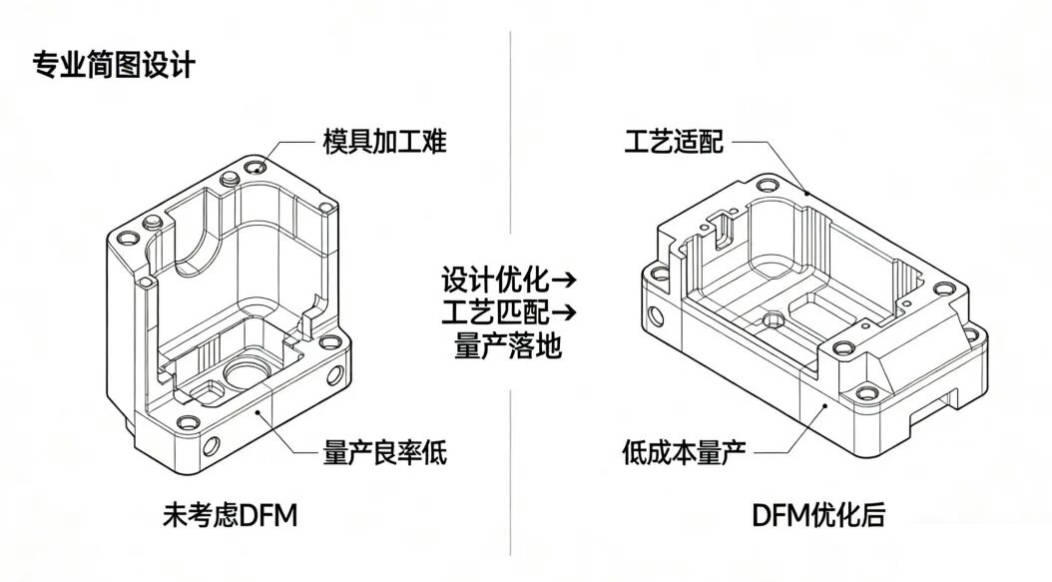 再优秀的设计方案,若超出工厂模具加工精度、设备行程范围,或需定制特殊工艺导致成本翻倍、良率低下,均无法实现量产。DFM的本质是让设计“落地”,确保图纸能转化为可批量生产的实物。 简图说明:左侧为未考虑DFM的设计(结构复杂、异形特征多,模具与加工难度大),右侧为DFM优化后设计(结构简化、特征标准化,适配批量生产工艺),箭头表示设计优化方向,体现“设计→工艺→量产”的衔接逻辑。