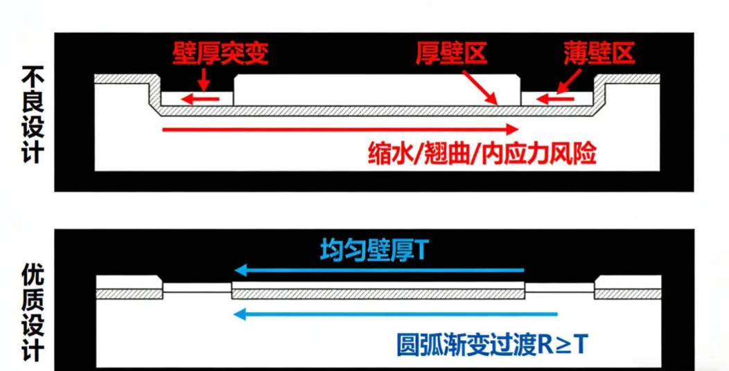 如同制作冰块,冰格厚度不均会导致薄处先凝固、厚处后凝固,内部应力使冰块开裂;塑胶产品成型时,壁厚不均会让熔体冷却收缩不同步,表面形成缩水痕,内部残留内应力,最终导致产品变形、强度下降甚至开裂。 简图说明:上图为不良设计,标注「壁厚突变」「厚壁区」「薄壁区」,红色箭头指示收缩不均方向,标注「缩水/翘曲/内应力风险」;下图为优良设计,标注「均匀壁厚T」「圆弧渐变过渡R≥T」,无缺陷风险标识,蓝色箭头指示熔体均匀冷却收缩,体现壁厚均匀的设计要求。