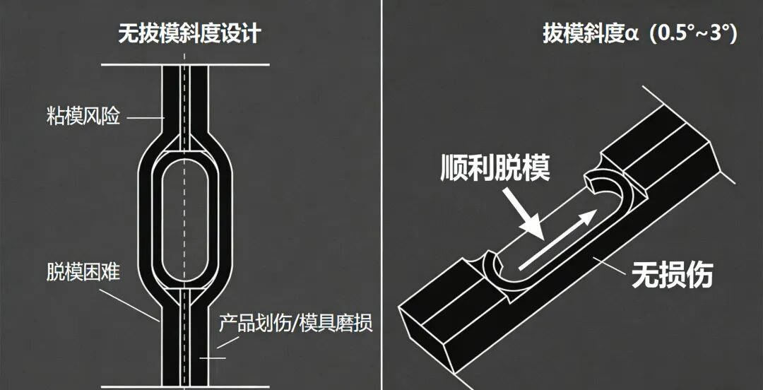 简图说明:左图为无拔模斜度设计,产品与模具型腔垂直贴合,标注「粘模风险」「脱模困难」「产品划伤/模具磨损」;右图为有拔模斜度设计,标注「拔模斜度α(0.5°- 3°)」,白色箭头指示脱模方向,标注「顺利脱模」「无损伤」,明确拔模斜度的方向、取值范围及核心作用。