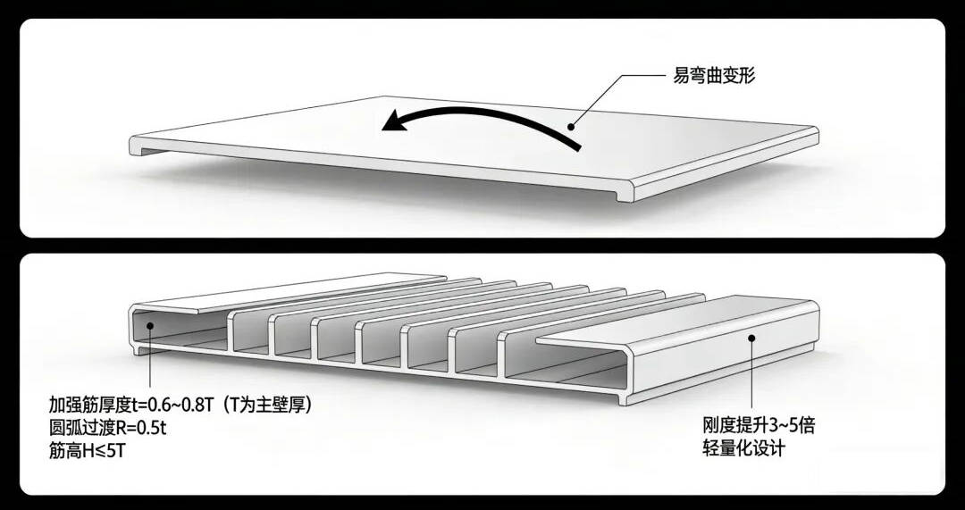 简图说明:上图为无加强筋结构,平板状产品标注「易弯曲变形」,黑色箭头指示弯曲方向;下图为加强筋设计,标注「加强筋厚度t=0.60.8T(T为主壁厚)」「圆弧过渡R=0.5t」「筋高H≤5T」,产品无明显变形,标注「刚度提升35倍」「轻量化设计」,同时展示加强筋的关键尺寸设计规范。