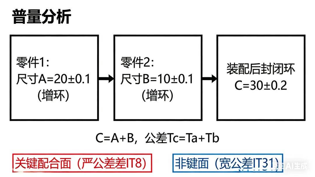 简图说明:展示简单装配尺寸链,标注「零件1:尺寸A=20±0.1(增环)」「零件2:尺寸B=10±0.1(增环)」「装配后封闭环C=30±0.2」,公式「C=A+B,公差Tc=Ta+Tb」体现公差累积规律;同时标注「关键配合面(严公差IT8)」「非关键面(宽公差IT13)」,直观说明公差分析与分配的核心逻辑。