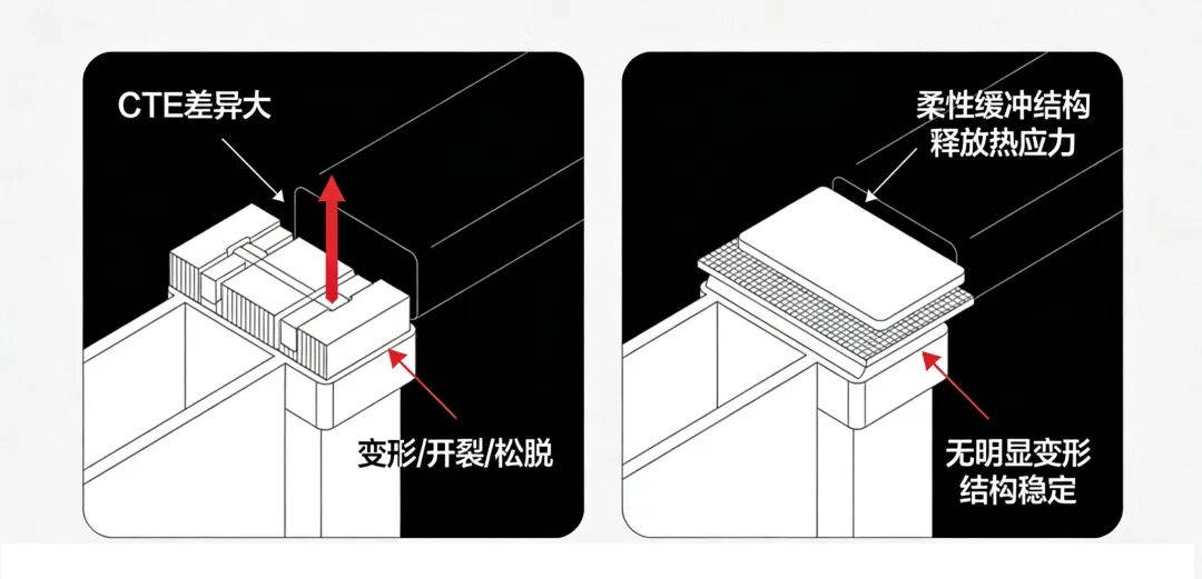 简图说明:左图为未考虑匹配的设计,塑胶件与金属件直接刚性连接,标注「CTE差异大」,高低温后标注「变形/开裂/松脱」,红色箭头指示变形方向;右图为匹配设计,增加硅胶垫柔性连接,标注「柔性缓冲结构」「释放热应力」,高低温后标注「无明显变形」「结构稳定」,展示热膨胀系数不匹配的核心解决方案。