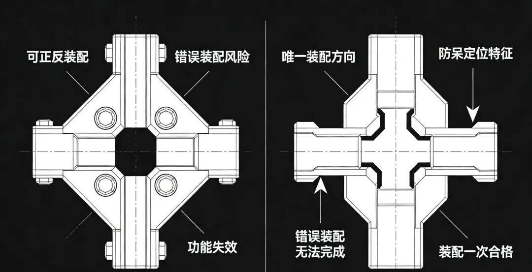 简图说明:左图为无防错设计,对称结构标注「可正反装配」「错误装配风险」「功能失效」;右图为防错设计,不对称定位槽标注「唯一装配方向」「防呆定位特征」,箭头指示正确装配方向,标注「错误装配无法完成」「装配一次合格」,展示防错设计的核心特征。