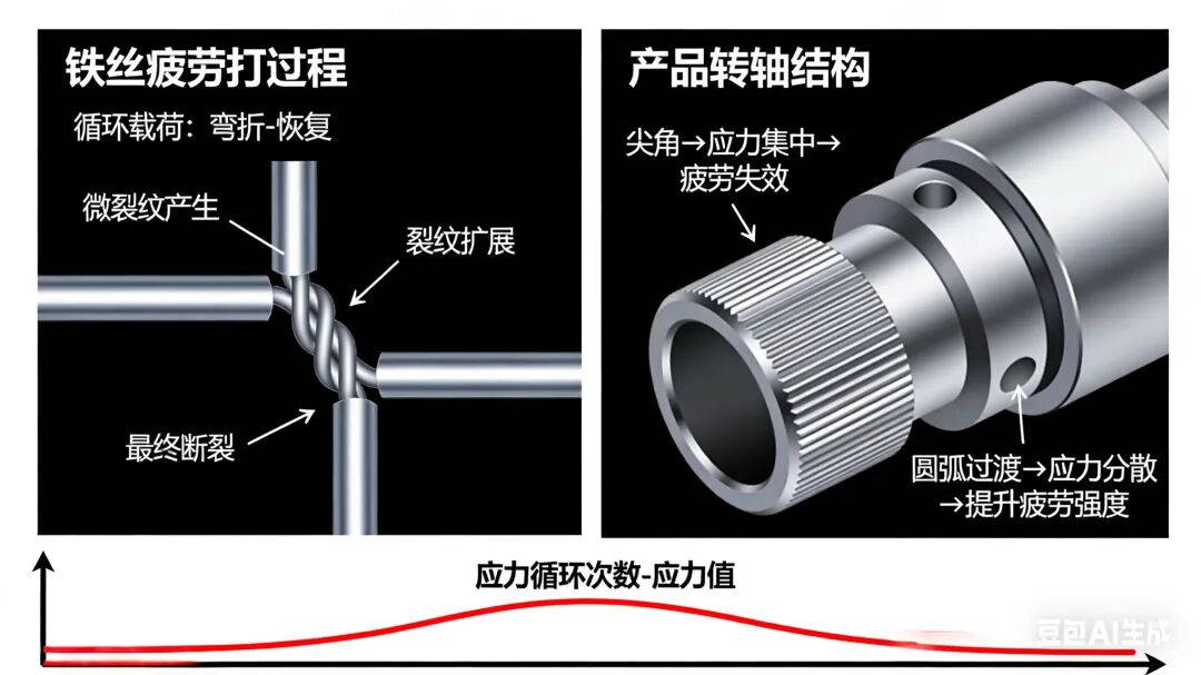 反复弯折铁丝,铁丝会从弯折处逐渐产生微裂纹,裂纹不断扩展最终导致铁丝断裂,这一过程即为疲劳破坏,铁丝的抗弯折能力就是其疲劳强度;产品中承受反复载荷的结构,若疲劳强度不足,会在长期使用中逐渐失效,如门合页断裂、按键弹片失去弹性。 简图说明:左侧为铁丝疲劳破坏过程,依次标注「循环载荷:弯折-恢复」「微裂纹产生」「裂纹扩展」「最终断裂」;右侧为产品转轴结构,优化前标注「尖角→应力集中→疲劳失效」,优化后标注「圆弧过渡→应力分散→提升疲劳强度」,红色曲线表示“应力循环次数-应力值”关系,体现优化后疲劳极限的提升。