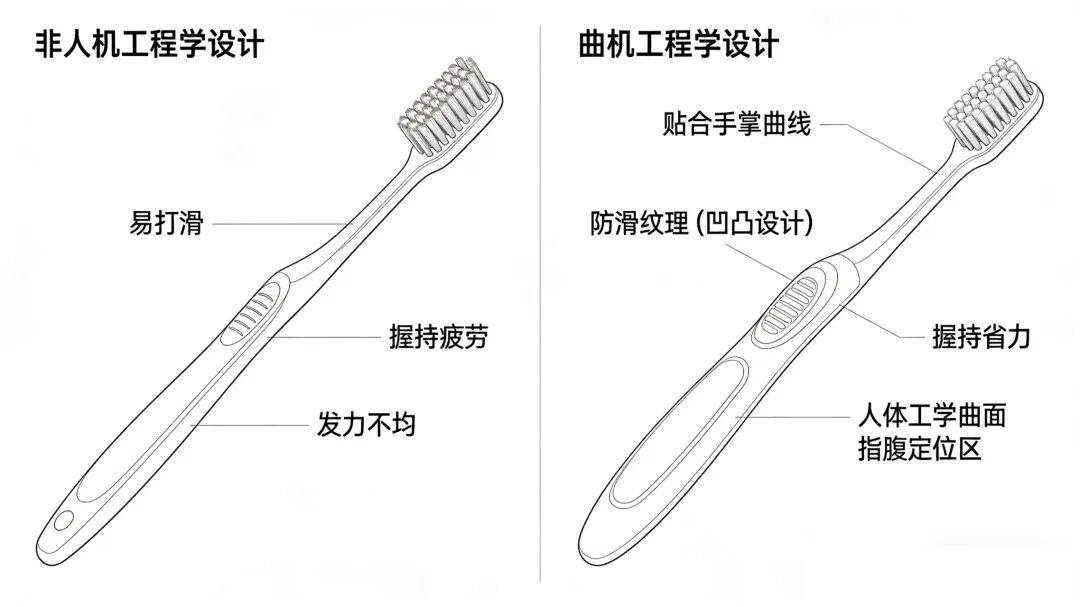 牙刷手柄的凹凸防滑纹理、鼠标的人体工学曲面设计、汽车方向盘的粗细与握感优化、保温杯的防滑杯身与易拧杯盖,都是人机工程学的典型应用;其核心不是追求产品外观的美观,而是让用户在使用过程中“顺手、舒服、不累”。 简图说明:左图为非人机工程学设计,直柄牙刷标注「易打滑」「握持疲劳」「发力不均」;右图为人机工程学设计,曲面防滑手柄标注「贴合手掌曲线」「防滑纹理(凹凸设计)」「握持省力」,同时标注「人体工学曲面」「指腹定位区」等核心设计特征,直观展示人机优化的关键要点。