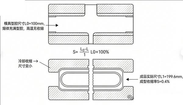 成型收缩率 S =(模具型腔尺寸 - 制品实际尺寸)/ 模具型腔尺寸 × 100%通俗讲:模具型腔设计为 100mm,冷却后产品实际尺寸为 99.6mm,那成型收缩率就是 0.4%;数值越大,说明塑料冷却收缩越明显,模具需做的 “放大补偿” 越多。
