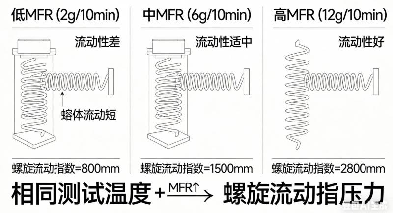 逻辑:MFR 高→熔体粘度低→流动性好,在螺旋模具中能流动的距离就越长(螺旋流动指数越大);反之 MFR 低,螺旋流动距离短。