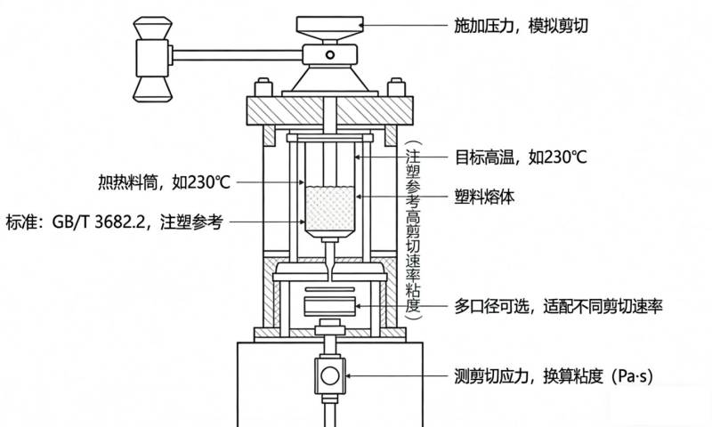统一标准:GB/T 3682.2(对应 ISO 1133-2),专门针对塑料熔体粘度测试;测试逻辑:与 MFR 测试原理相近,料筒加热到目标高温(如 PP230℃、PC300℃),熔体受压通过不同口径毛细管,测试熔体通过时的剪切应力 / 速率,换算出粘度(单位:Pa・s);