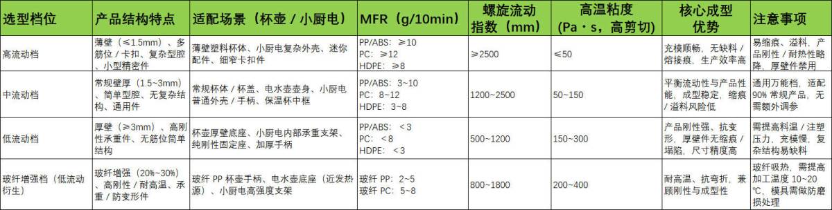1. 按壁厚定档 :壁厚是核心依据,≤1.5mm 选高流动,1.5~3mm 选中流动,≥3mm 选低流动,玻纤增强件单独归档;