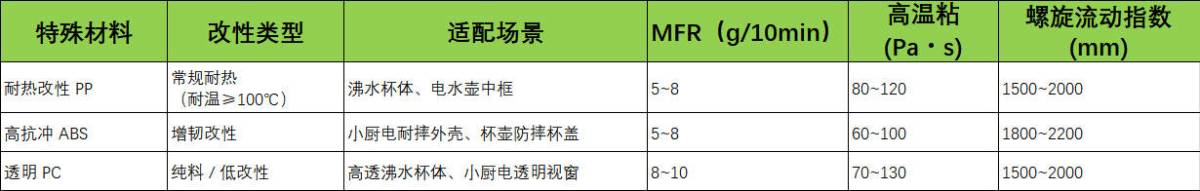 数值关联:MFR 越高→螺旋流动指数越大→高温粘度越低,三者呈正 / 负相关,本表按「成型难度 + 结构特点」分档,直接对号选型。 补充适配表(特殊材料 / 改性料)