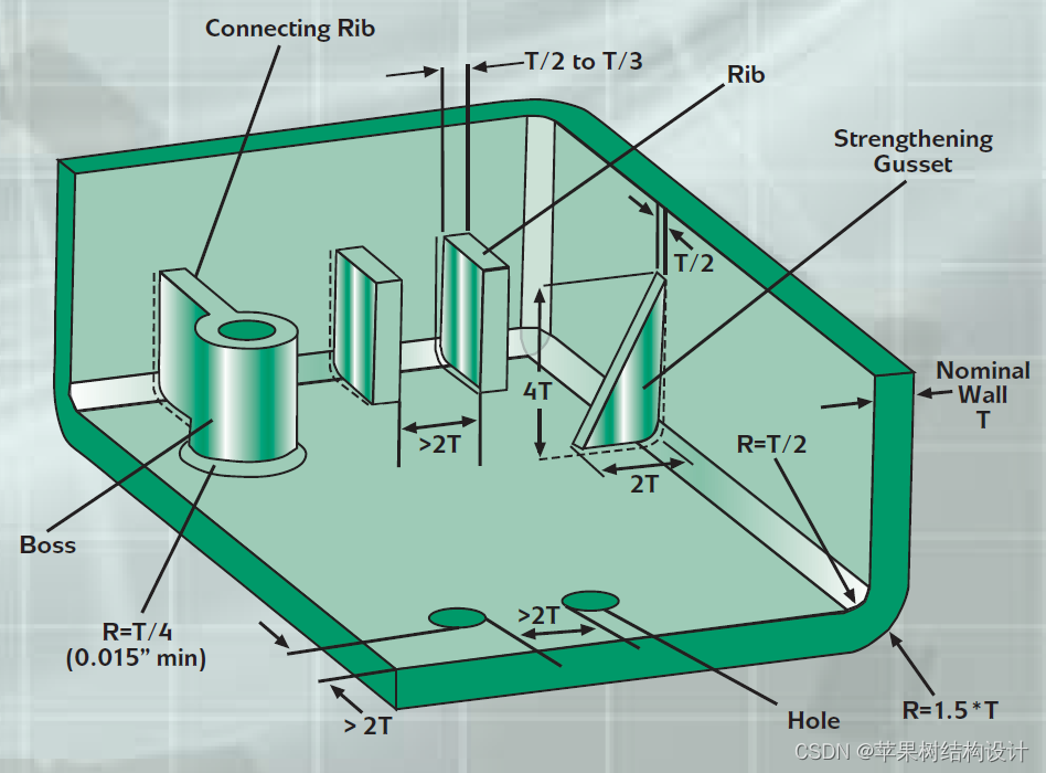 2.若对应的主体壁厚为外观面,且有较粗的皮纹,筋位的厚度可按主体壁厚的60%左右;