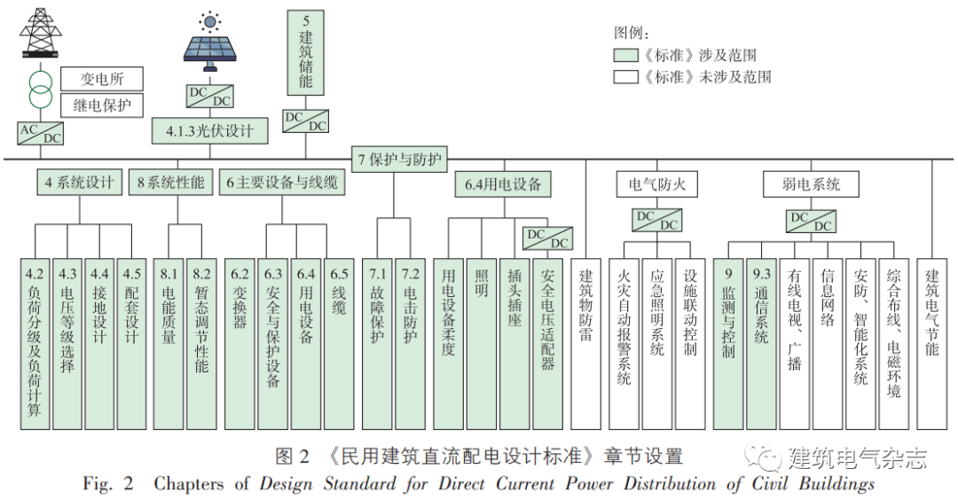 T/CABEE 030 - 2022《民用建筑直流配电设计标准》(以下简称《标准》)规定的直流配电系统主要由电源、配电及传输、用电设备和监控系统组成,如图1所示。 《标准》的主要内容包括直流配电系统设计、建筑分布式储能、主要设备与线缆选型、保护与防护、系统性能、监测与控制等方面,分为了9章21节,共计98条条文,如图2所示。