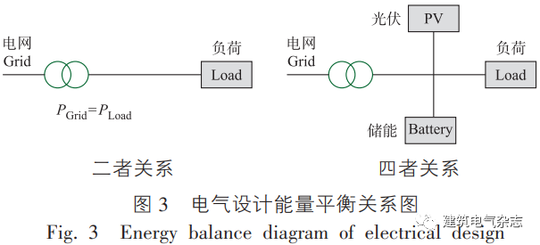 负荷计算是进行供配电系统电源容量设计与运行策略优化的基础。由于接入了本地可再生能源和储能等分布式电源,直流配电系统中能量的流动不只是从电网到负荷单向流动,而是在市政电网、分布式电源和负载之间流动,建筑与电网的关系也从单向供电转换成了双向互动,因此更强调逐时负荷与分布式可再生电源发电曲线的匹配。《标准》第3.0.2条明确规定:“直流配电设计应以实现GIB为目标,做到建筑光伏、建筑储能、用电负荷与城市电网供电的动态平衡”。对直流配电系统的设计,标准第4.2.3条要求计算用户逐时负荷和建筑分布式光伏逐时出力,以便实现各类电源和负荷的合理容量配置。电气设计能量平衡关系图如图3所示。