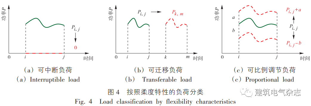 依据上述流程对系统容量进行计算后,通常会发现市政电源的容量小于负荷功率需求。在实际运行过程中,大部分三级负荷可以根据直流配电系统中供需平衡情况或外部电网的调节指令改变自身运行规律,降低或提高运行功率。建筑中所有用电设备的功率调节能力共同决定了建筑用能柔性(energy flexibility)。按照负荷功率调节实现的形式可分为可中断负荷、可迁移负荷、可比例调节负荷三类。在直流配电系统中,需要基于不同负荷的调节特性,在系统运行控制策略中设定用电负荷功率调节的优先次序,在需求响应或配电系统自身运行需要时调节负荷运行功率,实现柔性用电。《标准》在6.4.1条、6.4.2条和6.4.3条中分别对空调、电热水器、充电桩和照明等直流用电设备的功率主动响应功能进行了规定。按照柔度特性的负荷分类如图4所示。