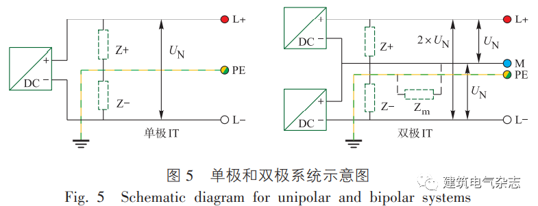 民用建筑直流配电系统架构按照变换器之间的连接关系可分为单层和双层或多层结构。《标准》第4.3.1条规定配电系统层级不宜超过3级,并在设计时尽可能减少电压变换层级,避免多级变换造成电能损耗以及供电安全性和可靠性损失。在此原则的基础上,民用建筑直流配电系统架构按照直流母线极性,可进一步分为单极系统和双极系统两种。单极直流系统形式简单,适合负荷功率均匀的场合;双极直流系统适用于供电区域较大,负荷容量差异大的场合。在《标准》第4.1.2条中优先推荐采用单极系统形式。在实际工程应用中单极和双极的选择主要应依据系统中直流负载的功率差异程度确定,如负荷都是15 kW以下的中小功率电器或都是15 kW以上的大功率电器,建议采用简单的单极375 V或750 V的系统形式,而当系统中同时存在大功率和小功率电器时,可采用真双极 ± 375 V母线形式。需要注意的是,真双极系统的变换器、断路器和线缆耐压等级都应按照系统中最高电压(也就是直流正负母线间电压)进行设计选型。单极和双极系统示意图如图5所示。