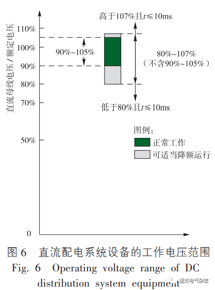 变换器选型不仅需要关注额定电压下的性能,还要考虑在直流母线电压波动范围内的控制和保护功能。具体来说,《标准》第6.1.1条对变换器设备工作电压范围和相应的运行状态进行了约定。当直流母线电压处于90 % ~ 105 % 额定电压范围时,设备应能按其技术指标和功能正常工作;当直流母线电压超出90 % ~ 105 % 额定电压范围,且仍处于80 % ~ 107 % 额定电压范围时,设备需要适当降额运行;当直流母线电压超出80 % ~ 107 % 额定电压范围,且持续时间不超过10 ms时,设备需要采取必要的保护措施。当直流母线电压恢复到90 % ~ 105 % 额定电压范围后,变换器也应自动恢复正常运行。直流配电系统设备的工作电压范围如图6所示。 同时,不同类型的变换器在直流配电系统中的作用有差异,对变换器的功能也有不同的要求。《标准》6.2.4条、6.2.5条、6.2.6条分别给出了交直流变换器、光伏变换器和电压适配变换器的类型和应具备的控制功能。其中,交直流变换器负责建立直流母线电压,应具备直流稳压功能;同时交直流变换器连接交流市电,是同电网柔性互动的接口,因此应具备根据指令调整直流母线电压的功能。为了提高光伏发电效率,连接光伏组件的光伏变换器应具备最大功率点跟踪(MPPT)功能,而当光伏发电功率大于负荷需求,直流母线电压升高到设定值时,光伏变换器应具备降功率限压功能,帮助直流母线电压稳定在设定范围。电压适配变换器主要用于连接不同电压等级的直流母线,满足不同设备对电压的要求,除了基本的电压控制功能,如果系统要求在不同直流母线之间实现功率调度,电压适配变换还应具备单向或双向功率调节能力。