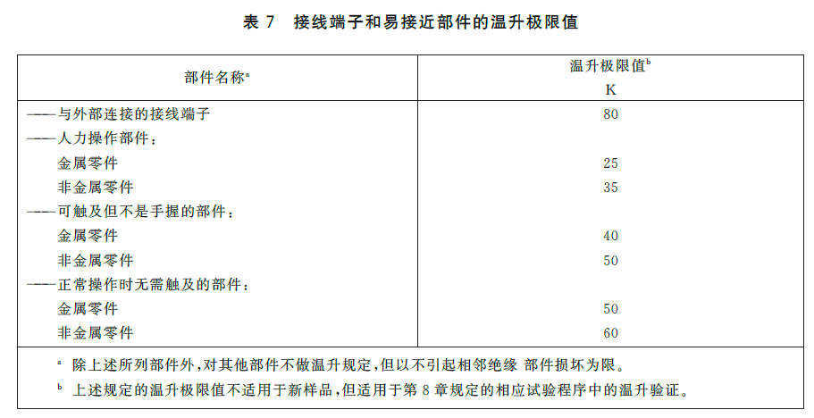 断路器在按8.3.3.7进行试验期间,在8.3.2.5规定的条件下测得的断路器几个部件的温升应不超过表7规定的极限值。断路器在按8.3.4.5和8.3.6.4进行试验期间,其接线端子的温升应不超过表7中规定的极限值。