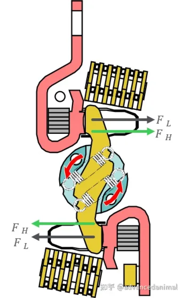 以施耐德NSX塑壳断路器为例,其静触头为U型导电回路,动触头为双旋转式(图2),动、静触头之间通过触头弹簧压紧,接触表面发生变形,仅在分散的一些小斑点上实现金属性接触,电流只能通过这些接触斑点流通,发生如图3所示的电流线收缩现象,根据“同向相吸异向相斥”原则,电流流过收缩线之后产生的电动斥力,称作霍姆力Fh。