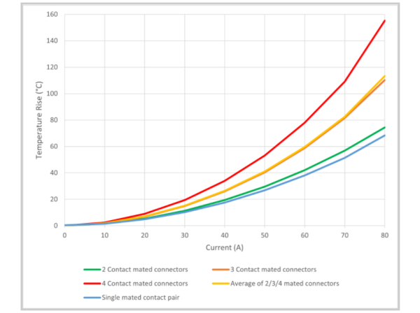 这听起来很简单——绘制测试数据、Y轴上的温度和X轴上的电流。下面是我们Kona测试的一个示例: 正如预期的那样,4触点接头产生的热量最大。有关Kona测试细节的更多详细信息,请查看测试报告HT076。