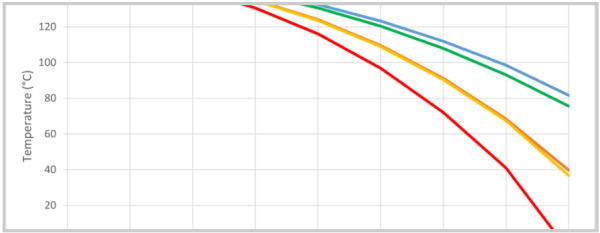 要生成第二张图,我们需要对温度进行一些数学计算。取最高工作温度并减去温升读数。这将为您提供每个电流级别的最高环境温度。例如,请参见以下示例数据: 将最高环境温度放在Y轴上,将电流放在X轴上。下面是Kona的例子: 在80A时,4触点Kona超过了150°C的最高工作温度,这就是为什么您看到该图下降到负温度读数的原因。