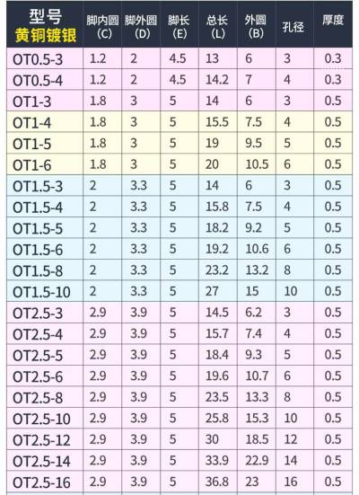 OT端子是一种圆形冷压端子,其命名来源于其外观形态,头部为圆形,尾部为圆柱形,整体呈现一个OT的形态。OT端子分为带绝缘体的和裸端头两种类型。